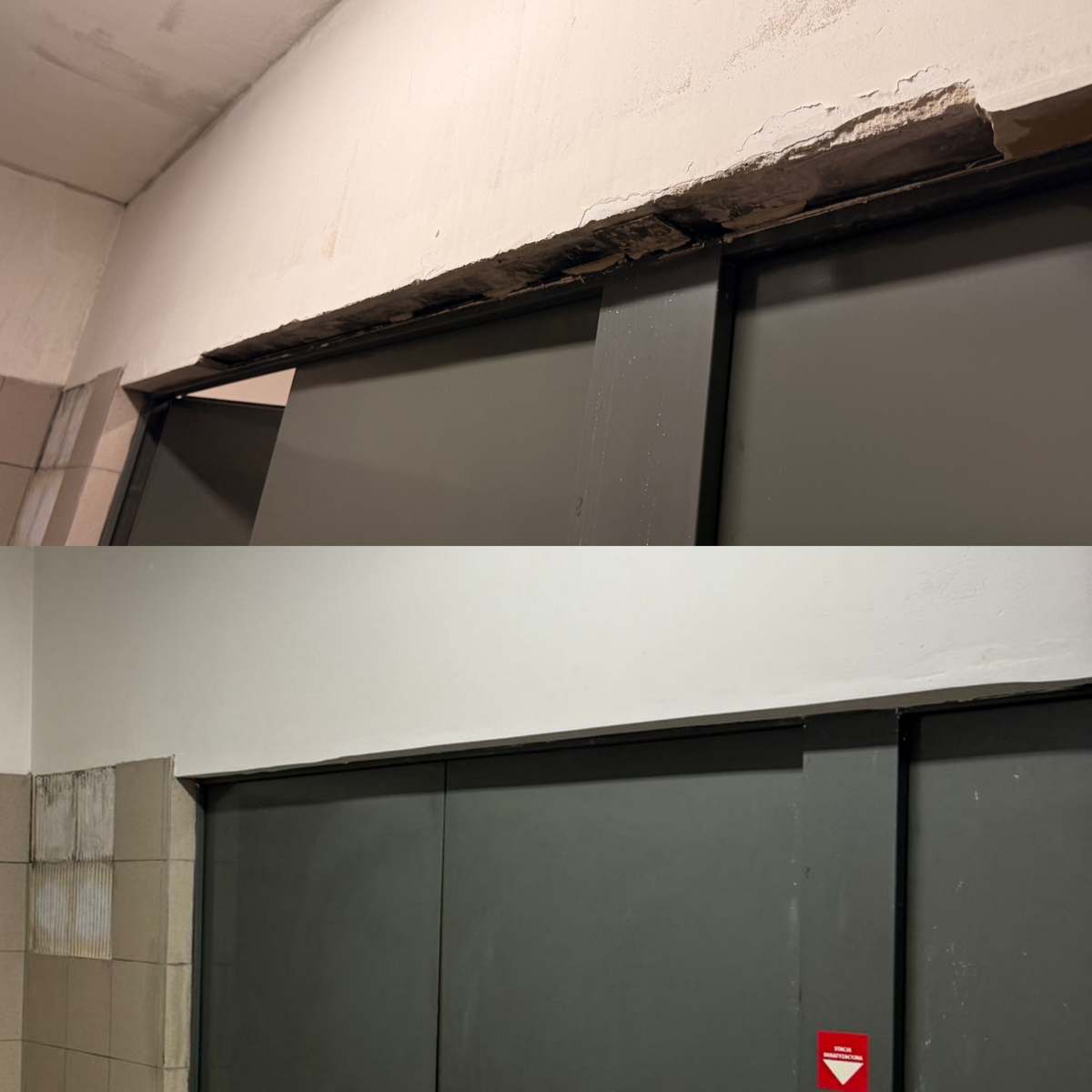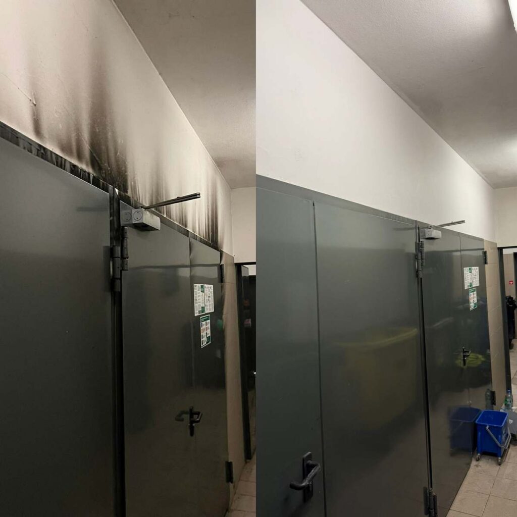 Tym razem zajęliśmy się usuwaniem skutków pożaru wiatki śmietnikowej w warszawskim Porcie Praskim. Pomieszczenie było silnie zadymione, a w górnych partiach ścian i przy suficie widoczne były intensywne okopcenia. Osad sadzy pojawił się również na instalacji wentylacyjnej oraz elementach wyposażenia. Posadzka była zabrudzona, a po akcji gaśniczej powierzchnie pozostały zawilgocone. Dodatkowo fragment nadproża drzwiowego wymagał naprawy tynkarskiej. Kluczowe było nie tylko usunięcie widocznych zabrudzeń, ale przeprowadzenie pełnego procesu technologicznego obejmującego czyszczenie, neutralizację osadów, osuszanie oraz odtworzenie powierzchni.