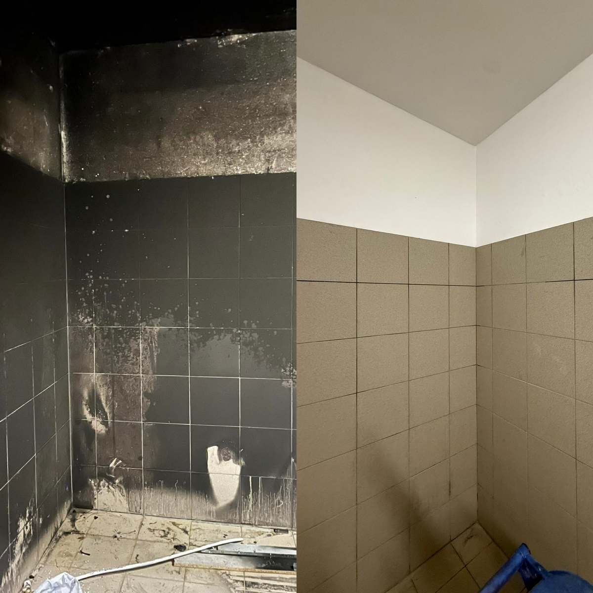 Pożar, nawet o ograniczonym zasięgu, pozostawia po sobie znacznie więcej niż tylko widoczne zniszczenia. Sadza osadza się na ścianach, suficie i instalacjach, zadymienie powoduje trwałe zabrudzenia, a woda użyta podczas akcji gaśniczej prowadzi do zawilgocenia konstrukcji. W tej realizacji naszym zadaniem było kompleksowe usunięcie skutków pożaru, przeprowadzenie osuszania oraz wykonanie prac remontowych przywracających pomieszczeniu pełną funkcjonalność i estetykę.