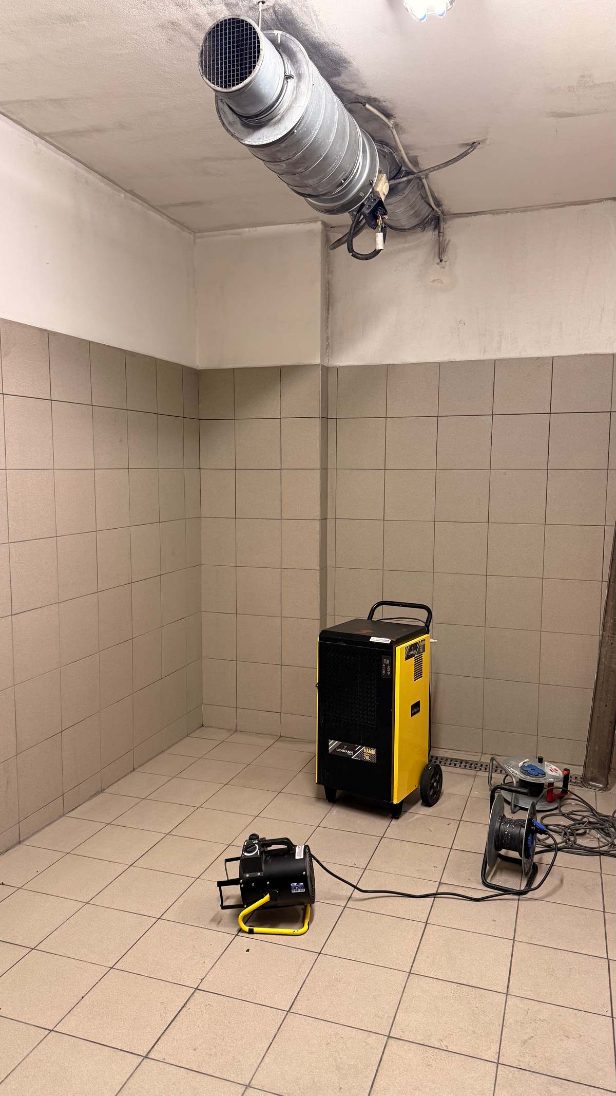 Wykorzystaliśmy osuszacz przemysłowy Lehmann Namib 70L pracujący nieprzerwanie przez 72 godziny. Dodatkowo przez trzy doby utrzymywaliśmy temperaturę pomieszczenia na poziomie około 20°C przy użyciu nagrzewnicy DEDRA 3000W. Takie połączenie pozwoliło skutecznie ustabilizować poziom wilgotności i przygotować powierzchnie do dalszych prac remontowych.